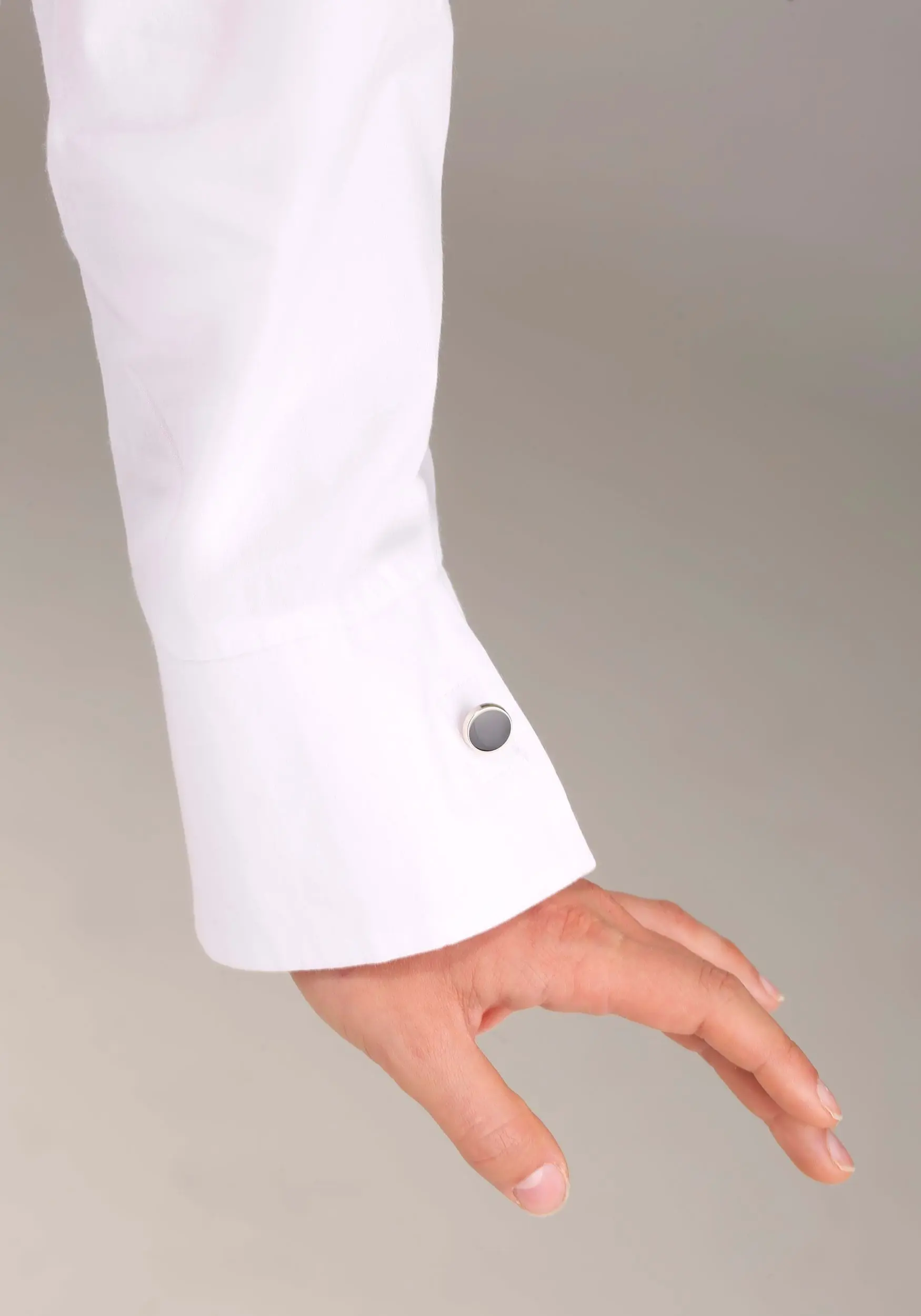 - Shirt has button and fabric loop at back of collar