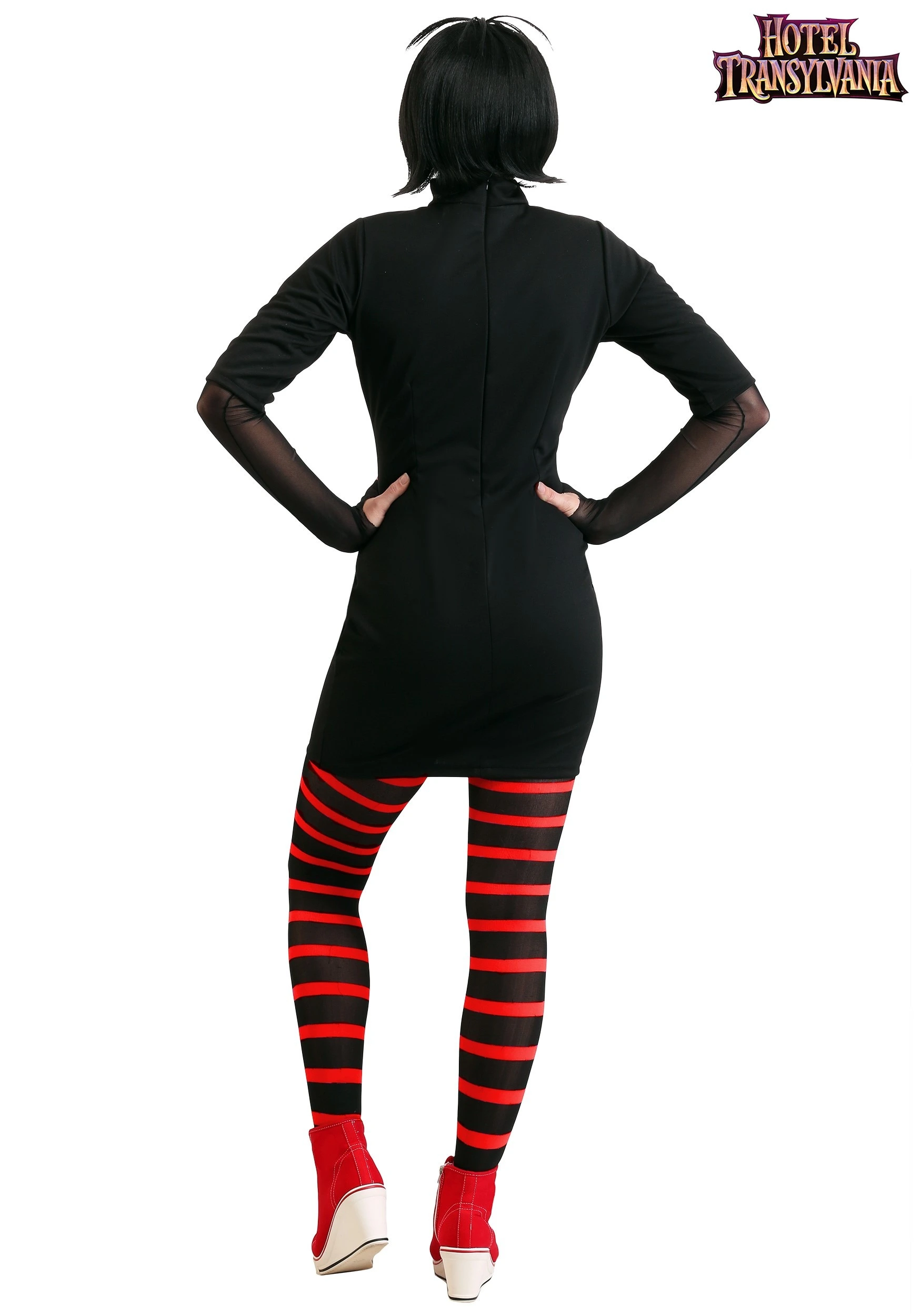 Well, let’s just help you get right with your wardrobe so you can enjoy a visit into the human city to show them what eternal fun is really like! This Made by Us look is perfect to help you achieve your every youthful vampire goal. We present the officially licensed Hotel Transylvania Mavis costume! This body-hugging black dress goes to your thighs and is short sleeved, but the mesh fingerless gloves make it look like long sleeves! (The goths will love you.) Finish off the look with your iconic red and black striped tights and the vampiric bob of a wig and you’re ready for some real magic!