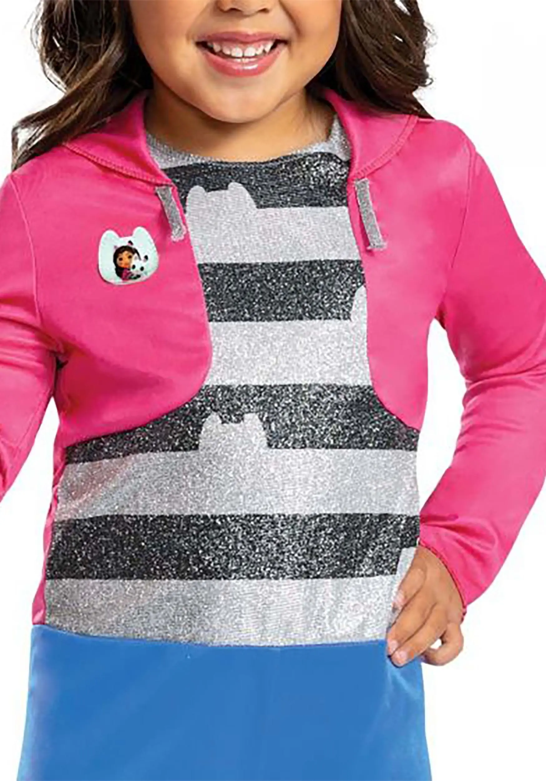 The pants portion of the jumpsuit is light blue to imitate Gabby’s jeans and features a printed kitty patch on one knee. A seam at the waist separates a sparkling black and white striped top based on the character’s signature outfit. Finally, hot pink jacket panels inspired by Gabby’s cardigan finish the jumpsuit. Complete the look with the cat ears headband that’ll have her holding on tight to all the cattastic fun!