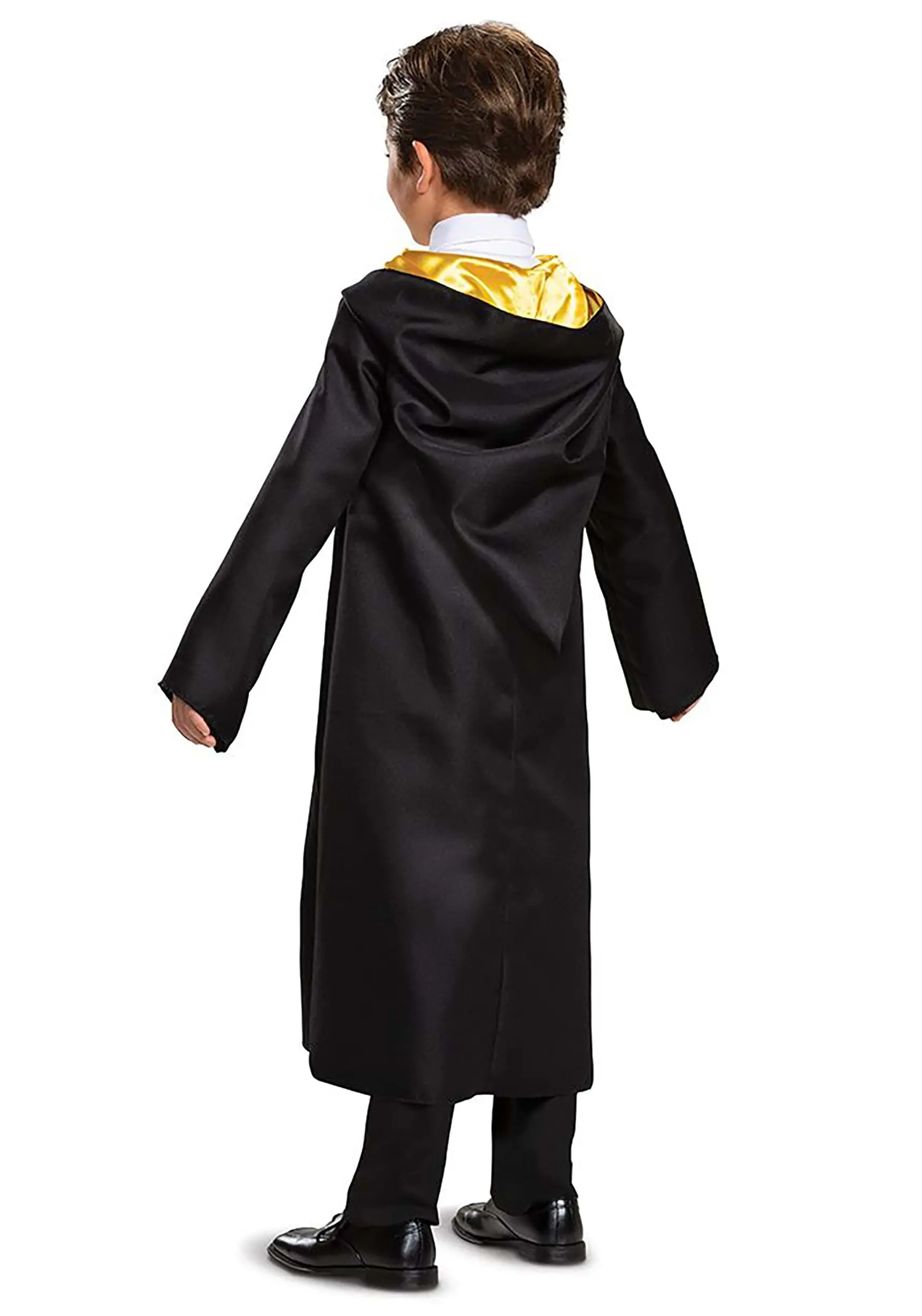 Show your House spirit when you wear your officially licensed Harry Potter Classic Hufflepuff Robe Costume for Kids! The outfit consists of a one hundred percent polyester robe in the traditional Hufflepuff colors signifying their element of Earth. A yellow printed patch on the left side of the chest displays the Hufflepuff crest with its rampant badger and additional symbolism. Hook & loop fastener at the front neckline keeps your robe in place while you are running late for class (avoid Professor McGonagall). The robe’s hood is lined with yellow satin for extra flair. Helga Hufflepuff would be so proud!Â