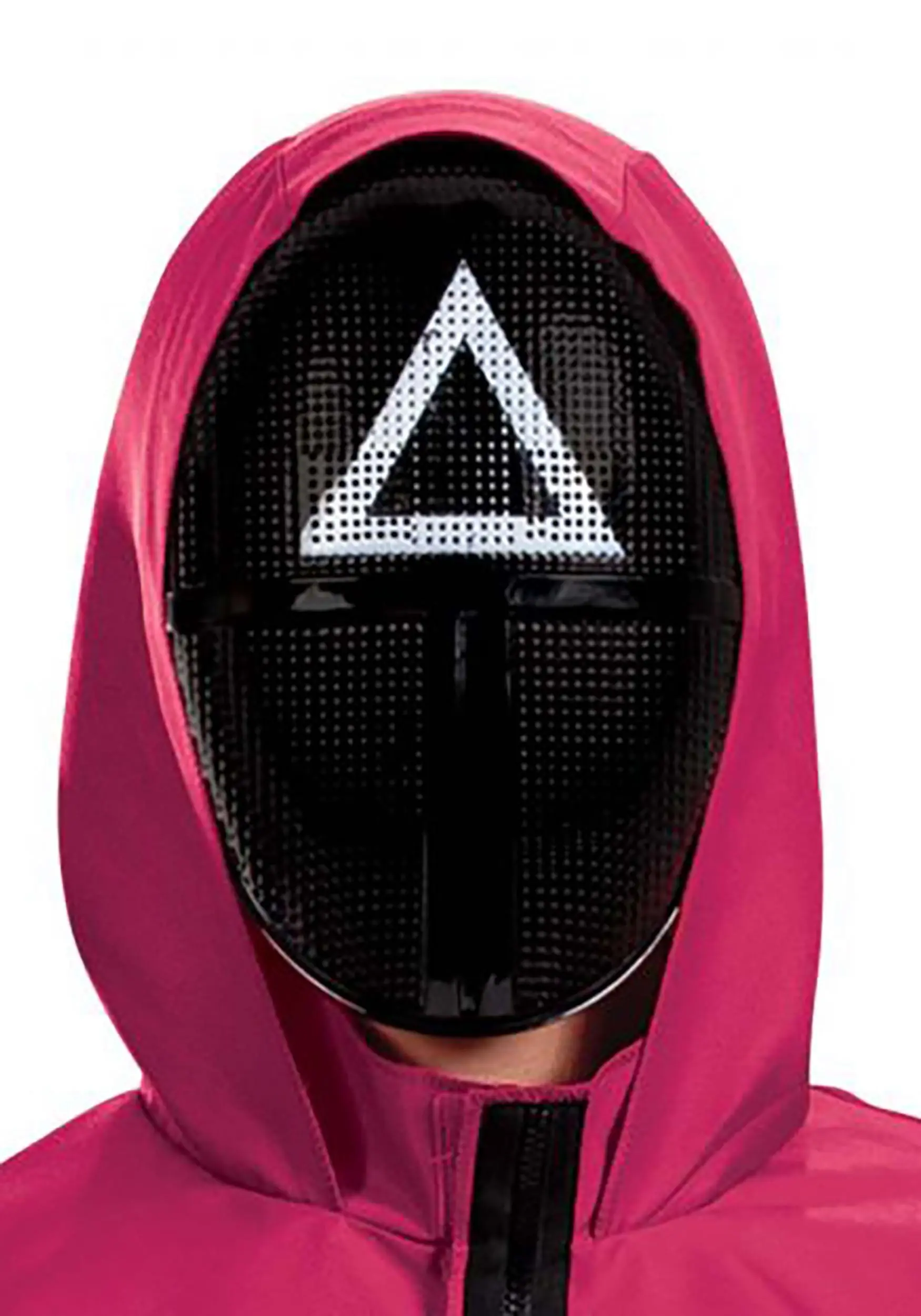 Deck yourself out in game-time glory with this Squid Game Triangle Guard costume. This officially licensed jumpsuit is a recreation of the red guard uniform worn by the middle-tier enforcers in the hit TV show. Step into the jumpsuit pants, fasten the front, and slip the triangle mask over your face to conceal your identity. Visibility can be limited in the Squid Game masks, so keep an eye out for any opportunity to advance. Just be sure you know the rules of the game!