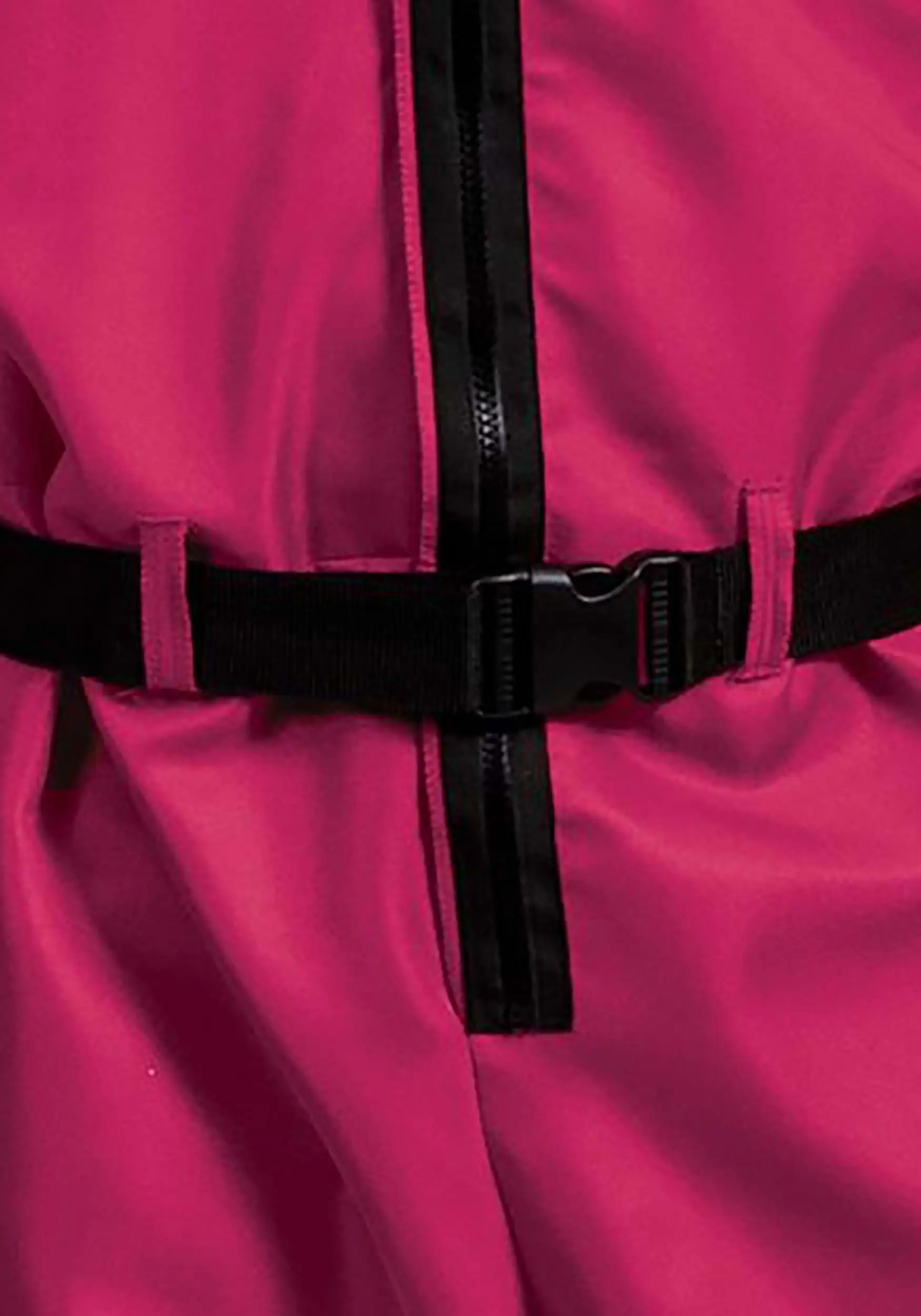 - Polypropylene webbing belt threads through loops at waistline of jumpsuit, fastens w/ plastic parachute buckle