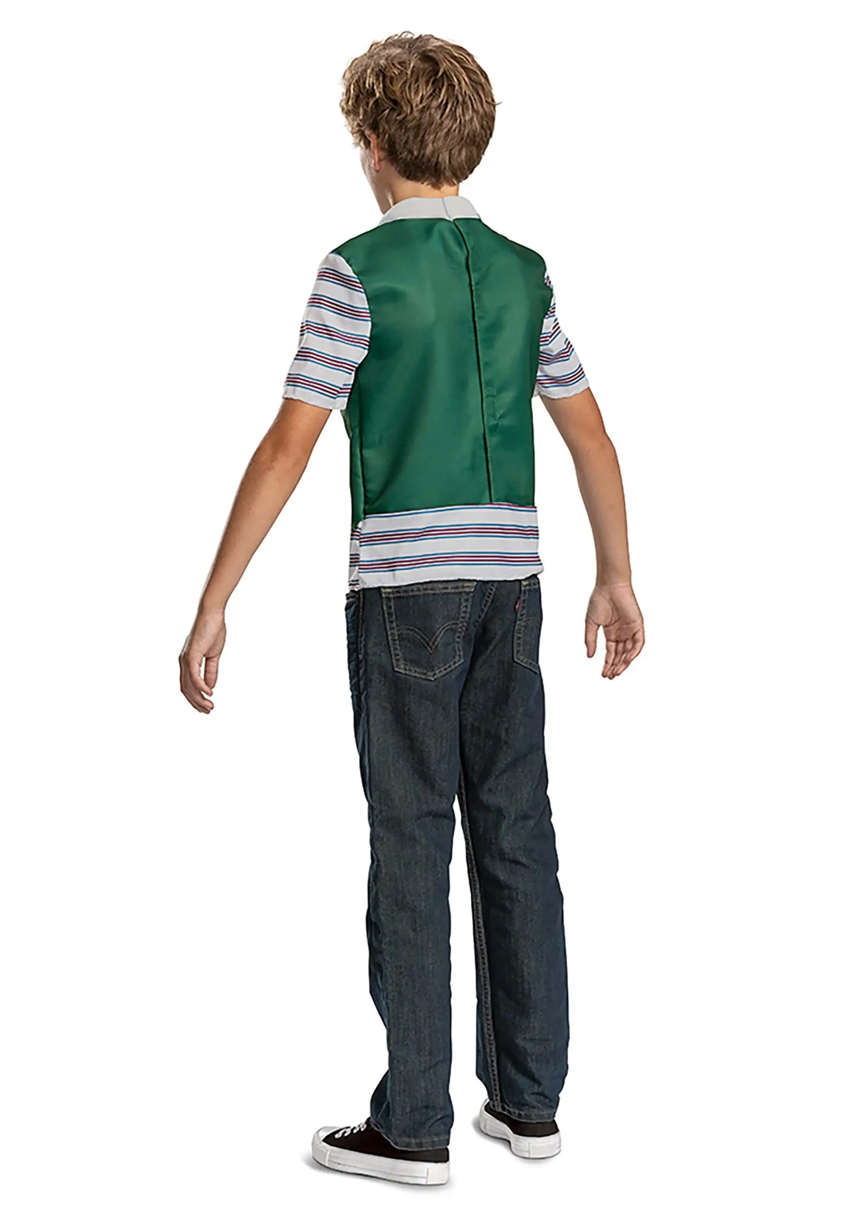 This officially licensed Stranger Things costume is a simple costume that goes on in a cinch! The costume is a just a single-piece top, which is styled to look like a short sleeve shirt with an attached vest over it. The shirt portion has a horizontal stripe pattern and it has a collar around the neck. The attached vest is green and has a gold name tag on one side, with the Video Stop logo on the other. Your child can just wear it with their favorite pair of jeans to instantly turn into the character from the series.