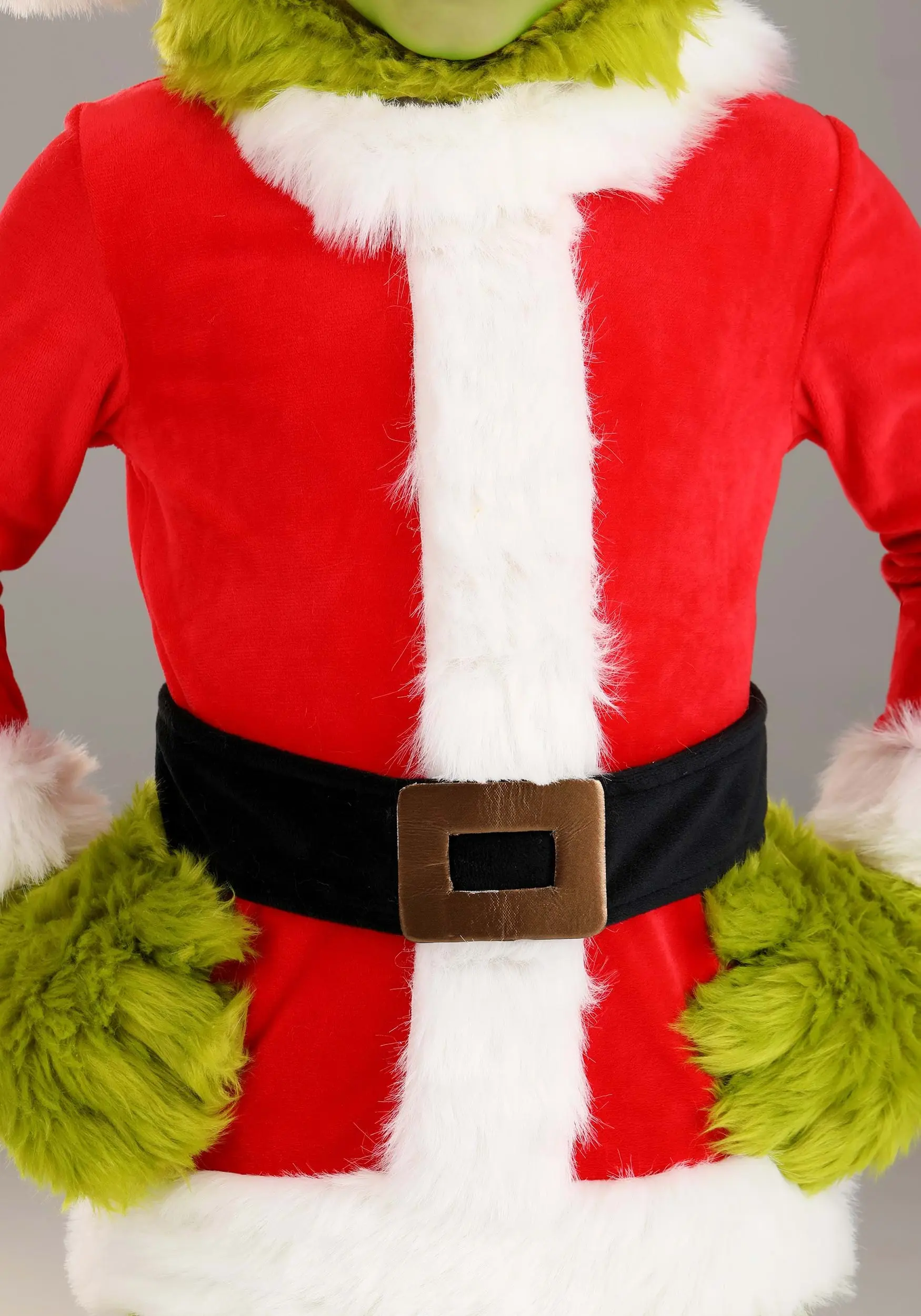Your toddler can be the most beloved green meanie on the block this year in a Dr. Seuss Santa Open Face Costume for Toddlers! This complete ensemble is a cute and comfy way to transform your tyke into one of the most iconic Christmas characters of all time! Start with the velvety red Santa jacket just like the “Santy Claus” one the Grinch stitched himself. It’s trimmed with white faux fur and goes great with the wide black band and its shiny gold-colored buckle in the center. The green, shaggy faux fur legs of the pants look great with the matching boot covers and gloves, and the pull-on hood with its attached Santa hat completes the costume perfectly.Â