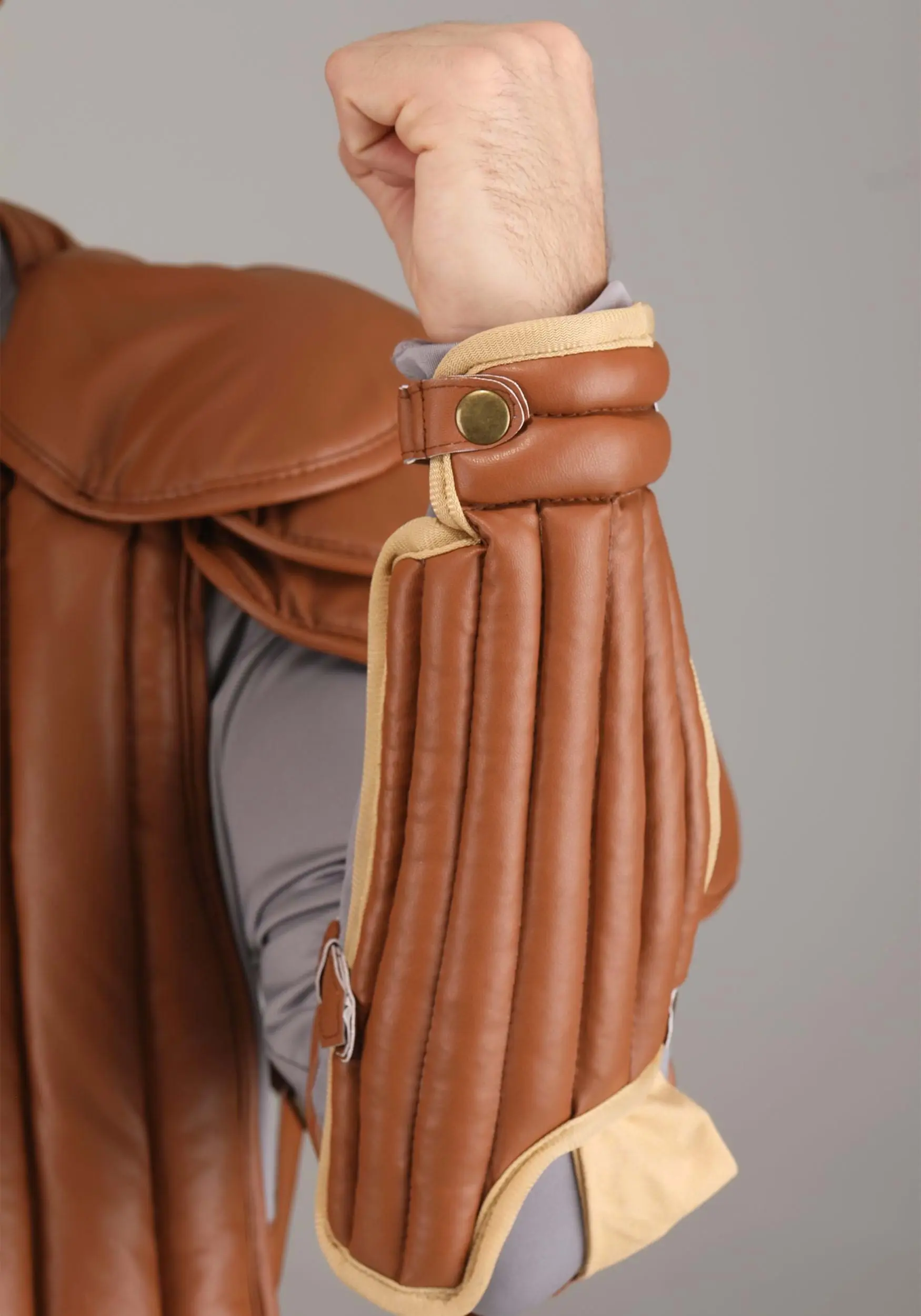 - Gauntlets and shin guards are held in place by length-adjustable faux leather straps with metal buckles