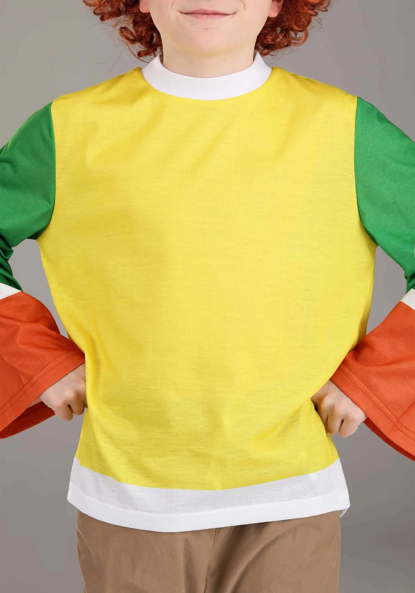 You’ll fit right in at your grandpa’s hotel thanks to this officially licensed, exclusive Hotel Transylvania Dennis Costume Kit for Kids! The set includese a long-sleeved pullover shirt that looks just like Dennis’s, thanks to its yellow and white torso and its green, white, and orange-striped sleeves. The wig cap features an elastic edge and is covered with curly red synthetic hair.Â