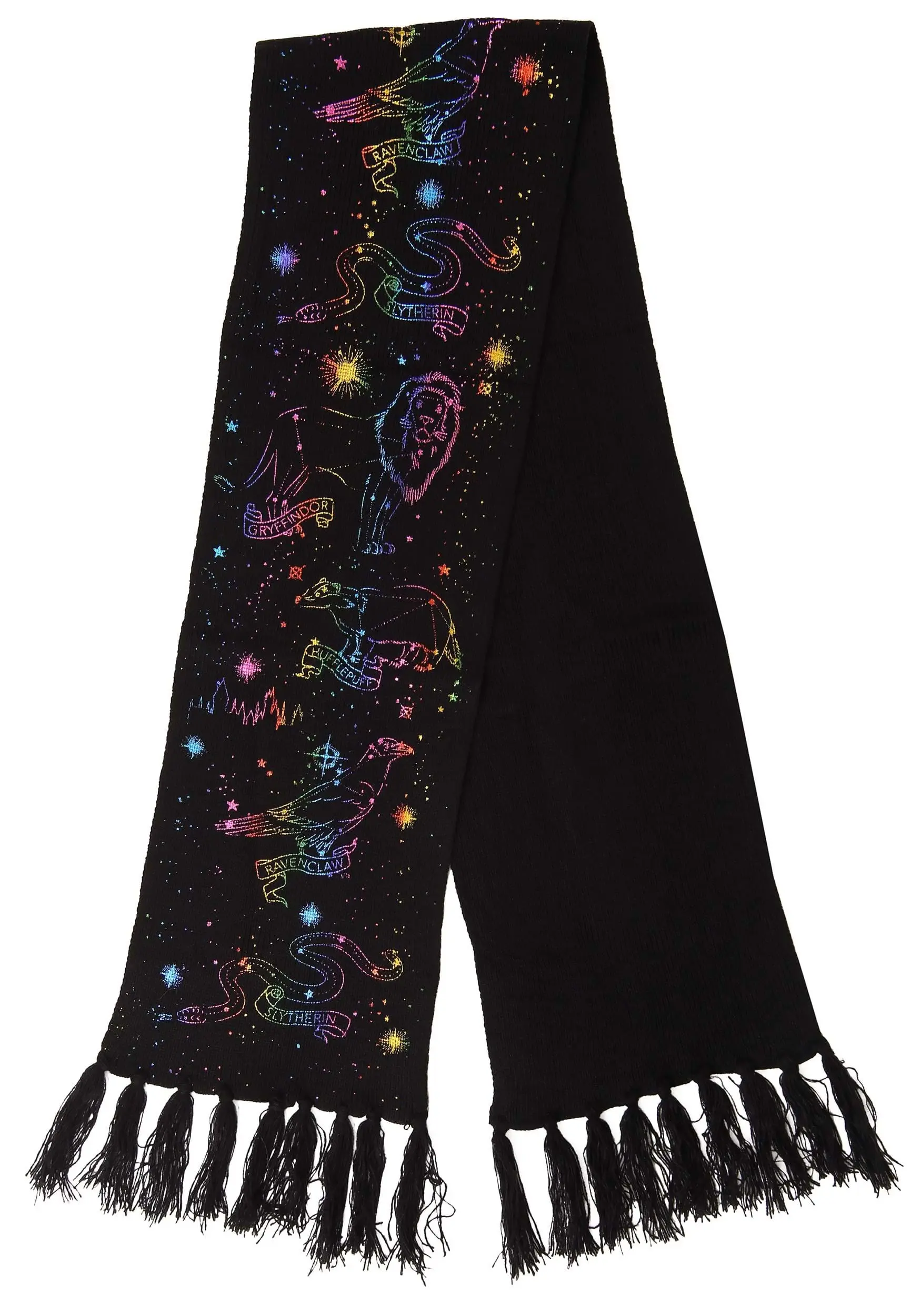 You’ve found the perfect accessory to bring your fashion dreams to life with this Hogwarts House Emblem Constellation Knit Scarf! Starting with a solid black knit base, this stylish scarf is sure to fit right in with your Hogwarts wardrobe. Meanwhile, dreamy rainbow-colored constellations of each Hogwarts house symbol are printed on the front of the scarf. Vibrant and yet subtle, this officially licensed accessory creates a magic all your muggle and wizarding ensembles will benefit from. So, whether you’re looking to jazz up your Hogwarts robes or add a bit of magic to your muggle wardrobe, this scarf has you covered.