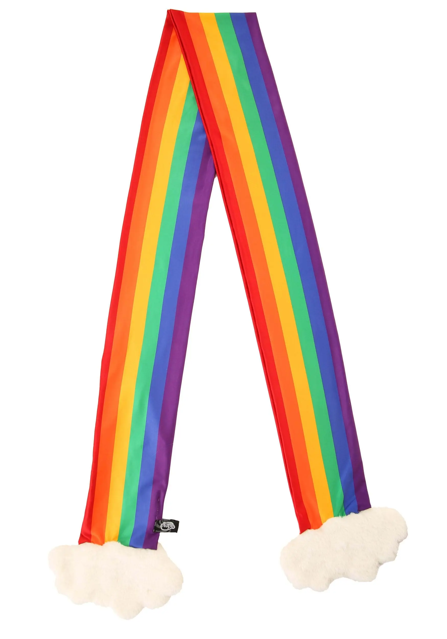 Wrap yourself up in a familiar sunshiney feeling with this Rainbow Plush Scarf! Made with super-soft, rainbow-striped fabric and featuring two bright white, faux fur clouds, this cheerful scarf is the physical representation of your happy-thoughts. A hidden pocket at one end of the scarf lets you safely carry the essentials as well—another great reason to smile. Cozy and colorful, this unique accessory is the perfect addition to your year-round wardrobe!