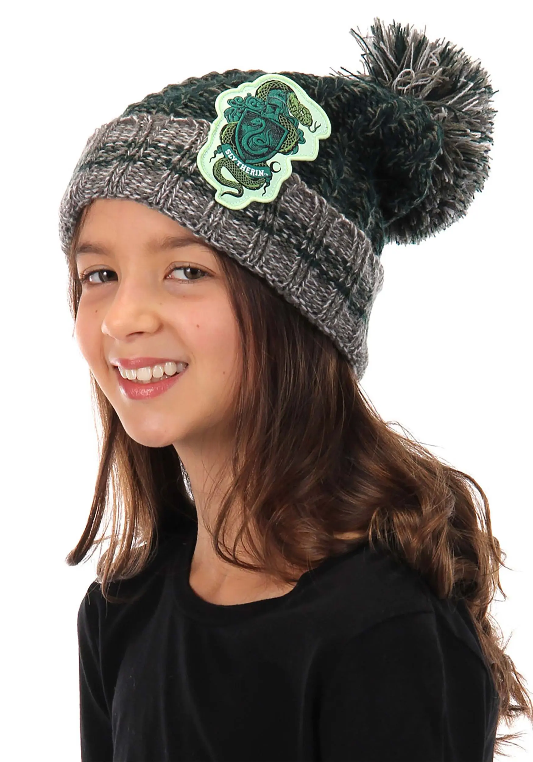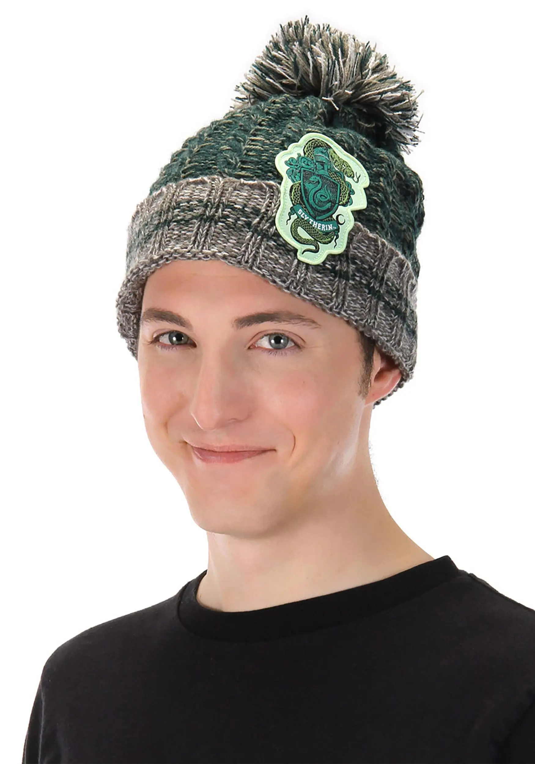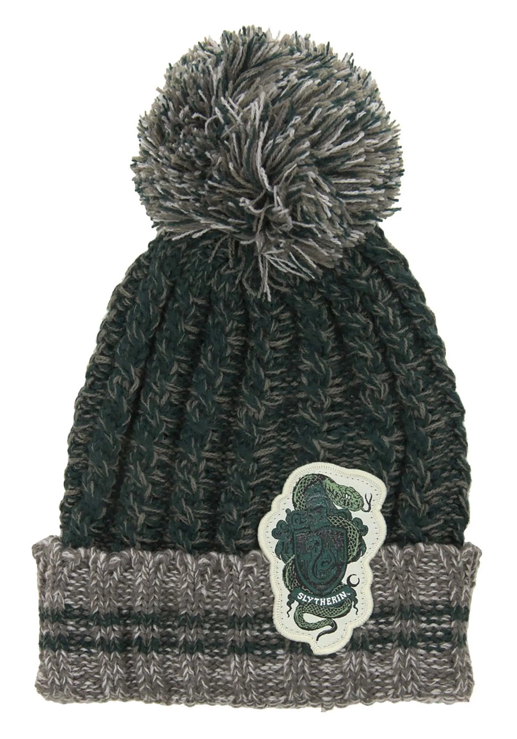 Okay, let’s start out by saying that Slytherins get a bad rap. There is nothing wrong with being ambitious or cunning! Sure, there have been some bad apples, but that is true of every Hogwarts house. While the traits of Slytherin can tend towards the dark, there are plenty of fine Slytherins who have helped the wizarding world. So be loud and proud, Slytherins! Show off your house affiliation with this fashionable Slytherin Heathered Pom Beanie.Â