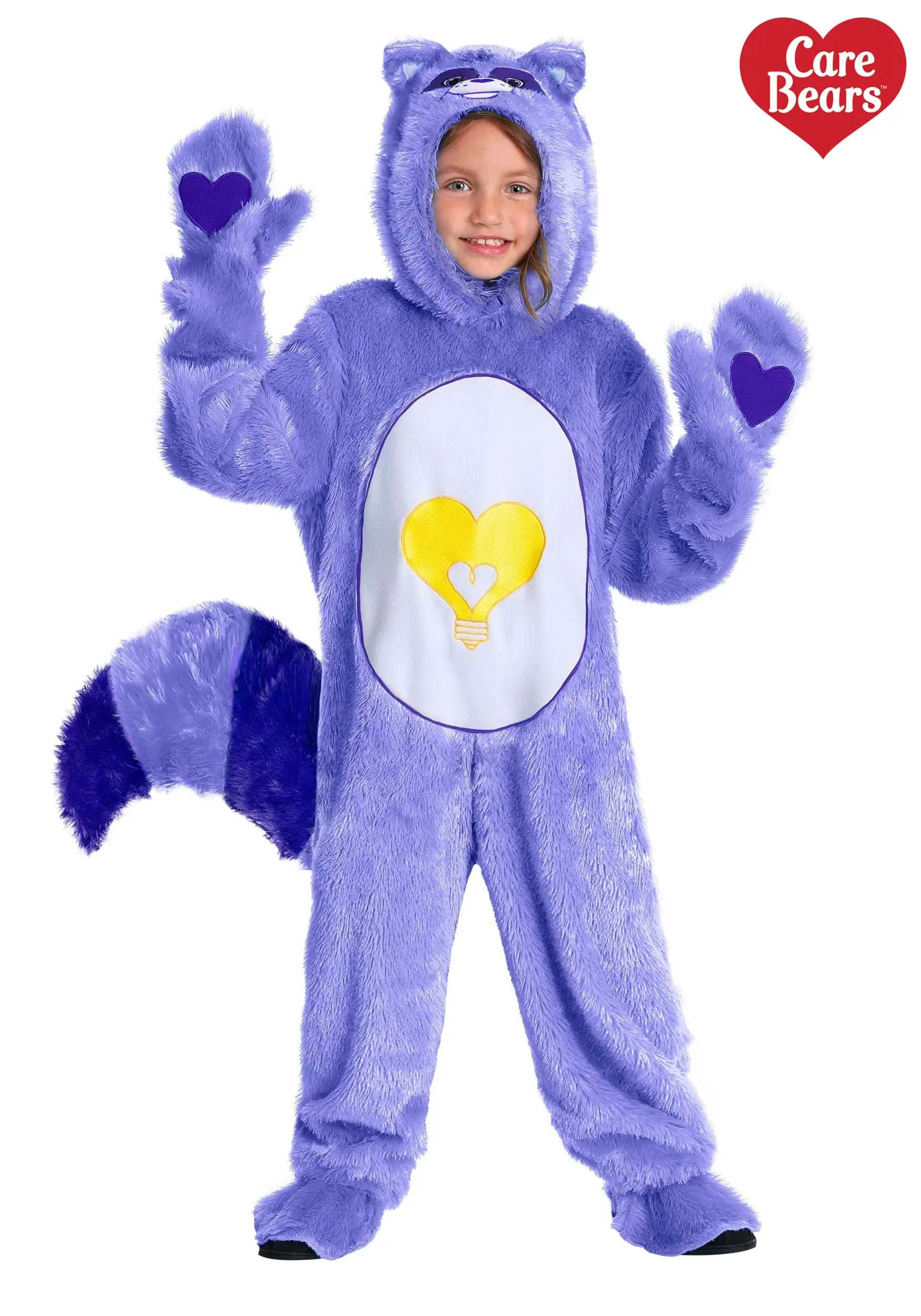 Like all of our licensed Care Bears costumes, this Bright Heart costume is made with…well…lots of care! It’s a super-soft faux fur jumpsuit in Bright Heart’s signature violet hue, with a large raccoon tail attached to the back. Your child will be covered from head to toe with the attached mitts (with heart accent patches) and shoe covers. The hood reveals Bright Heart’s face and ears (and helps ward off the chill while collecting candy). And of course, we didn’t forget about Bright Heart’s illuminating belly badge that helps people feel creative and bright! Cool!