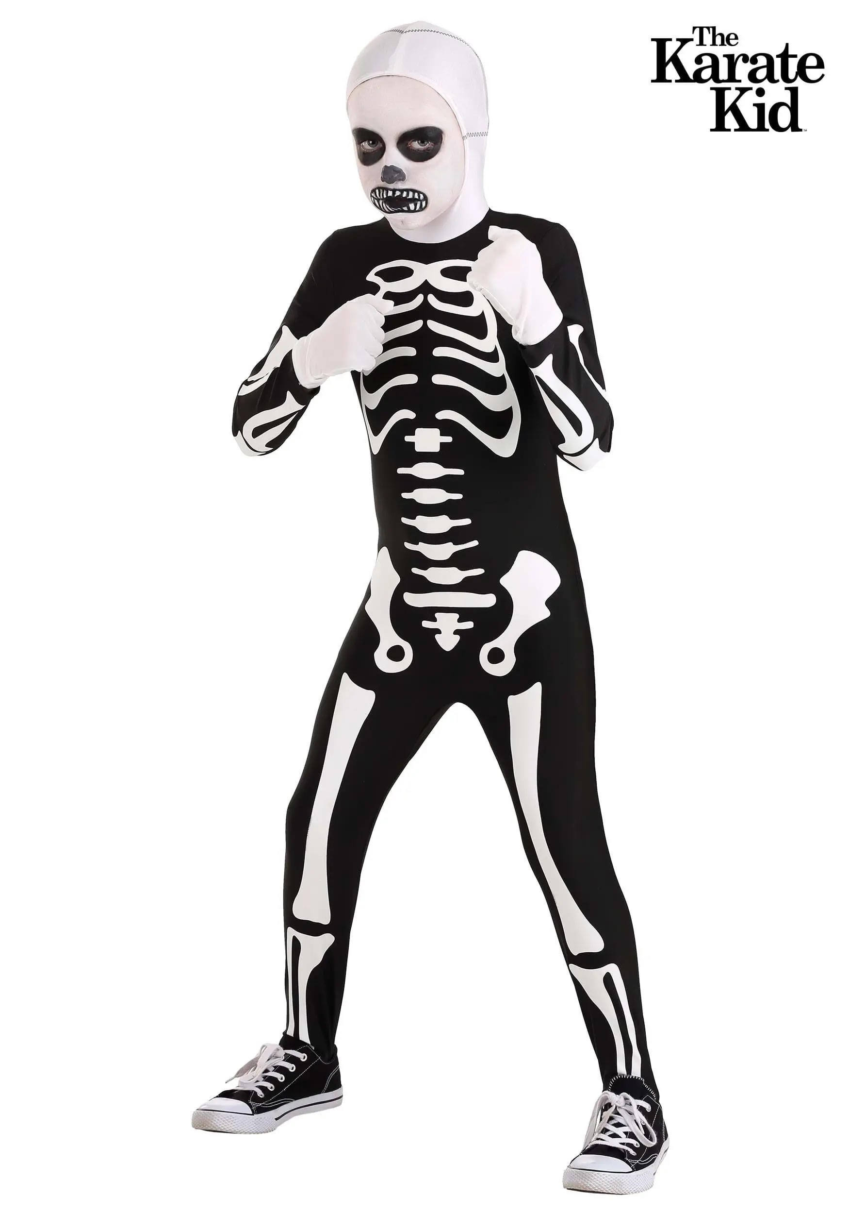 Well, since we were working with the Cobra Kai dojo, we here at Halloweencostumes.com have developed the perfect defense for that glaring, abdominal weakness. We have created this Kid’s Authentic Karate Kid Skeleton Suit, which, as you can see, has no guts at all included. Leaving your opponent only hard, pointy bones to strike is a sure way to win any karate competition you find yourself in! Best of all, it is not illegal, like the kicks to the head that some people use.