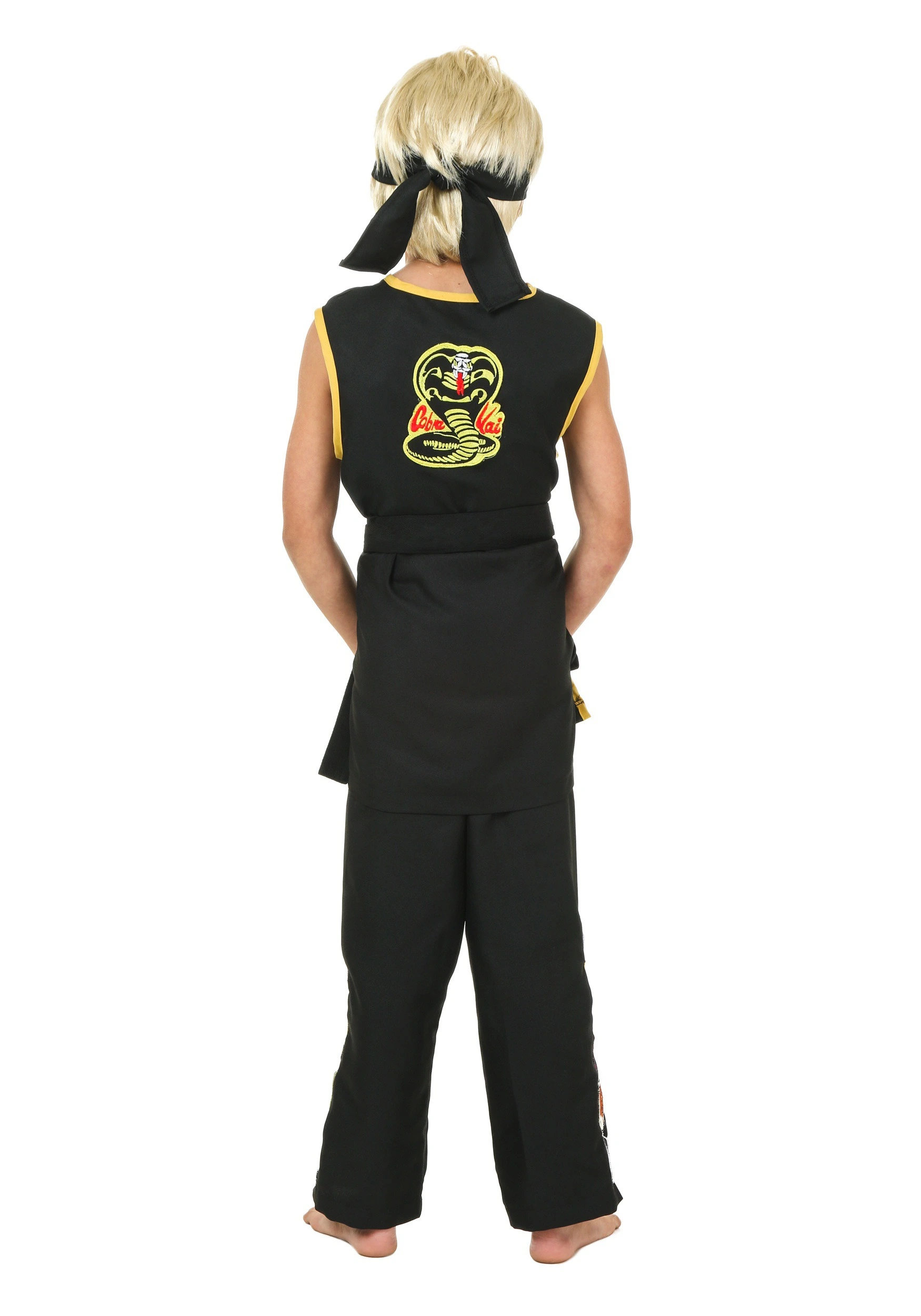 The costume looks just like a karate uniform, with a black tunic and elastic waist pants roomy enough for all those jumps and skills. There’s a black belt (of course), gold trim and official looking embroidered Cobra Kai dojo patches on the tunic and down the left pants leg. The wide headband also has a patch at the center ties on just like Johnny Lawrence’s. The whole thing comes together to will make your child look ferocious when he strikes a pose and yells the Cobra Kai dojo’s famous mantra, “Strike first! Strike hard! No mercy!”
