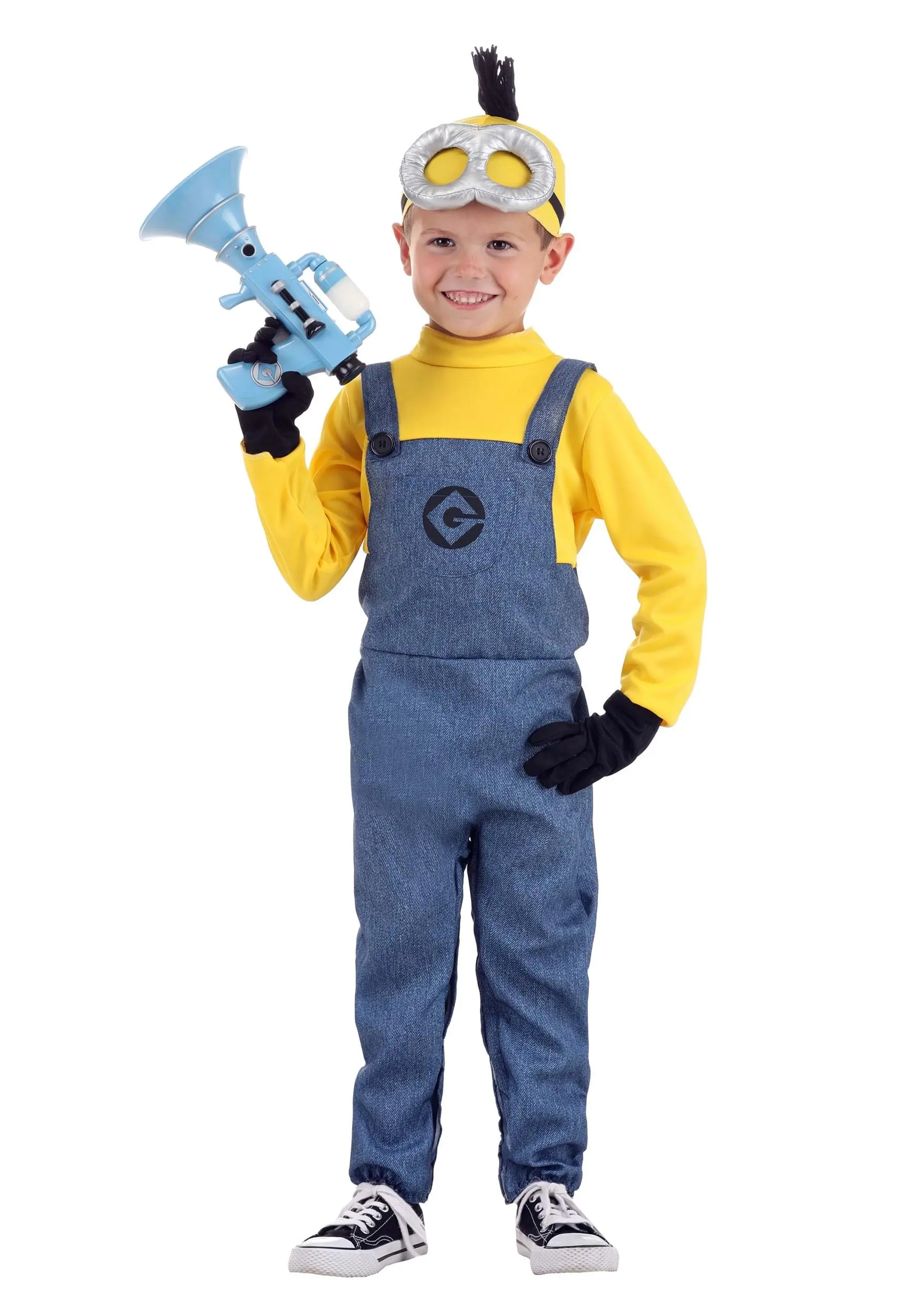 Your little one will be prepared for supervillain hijinks in this officially licensed Minions Toddler Minion Costume for Boys! The jumpsuit-style outfit fastens up the back and has a mock turtleneck collar. The sleeves, upper back, and upper chest are bright yellow to mimic a Minion’s skin tone, while the faux overall straps, torso, lower back and legs are made of denim-colored fabric. Gru’s symbol is printed on the chest over a faux pocket. Add the included yellow headpiece with its tuft of faux hair and silver goggles!Â