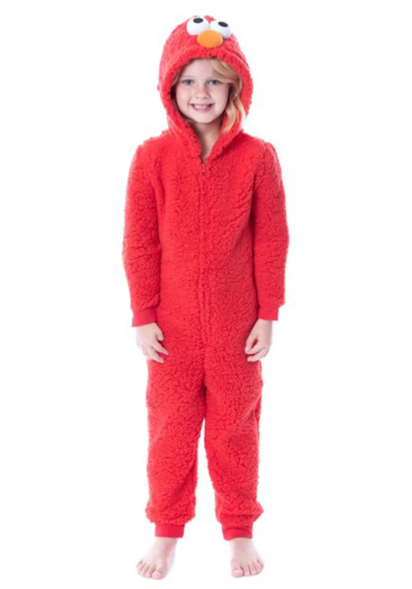 Your toddler can become his or her favorite red monster with this officially licensed Sesame Street Elmo Toddler Union Suit! The hooded union suit zips up the front and is made of super-soft red shearing sherpa fabric that is so comfortable and snuggly, your child may never want to take it off. Ribbed knit cuffs lock in warmth and make it extra snuggly. Soft, sculpted Elmo eyes and an orange nose are sewn to the top of the hood.Â