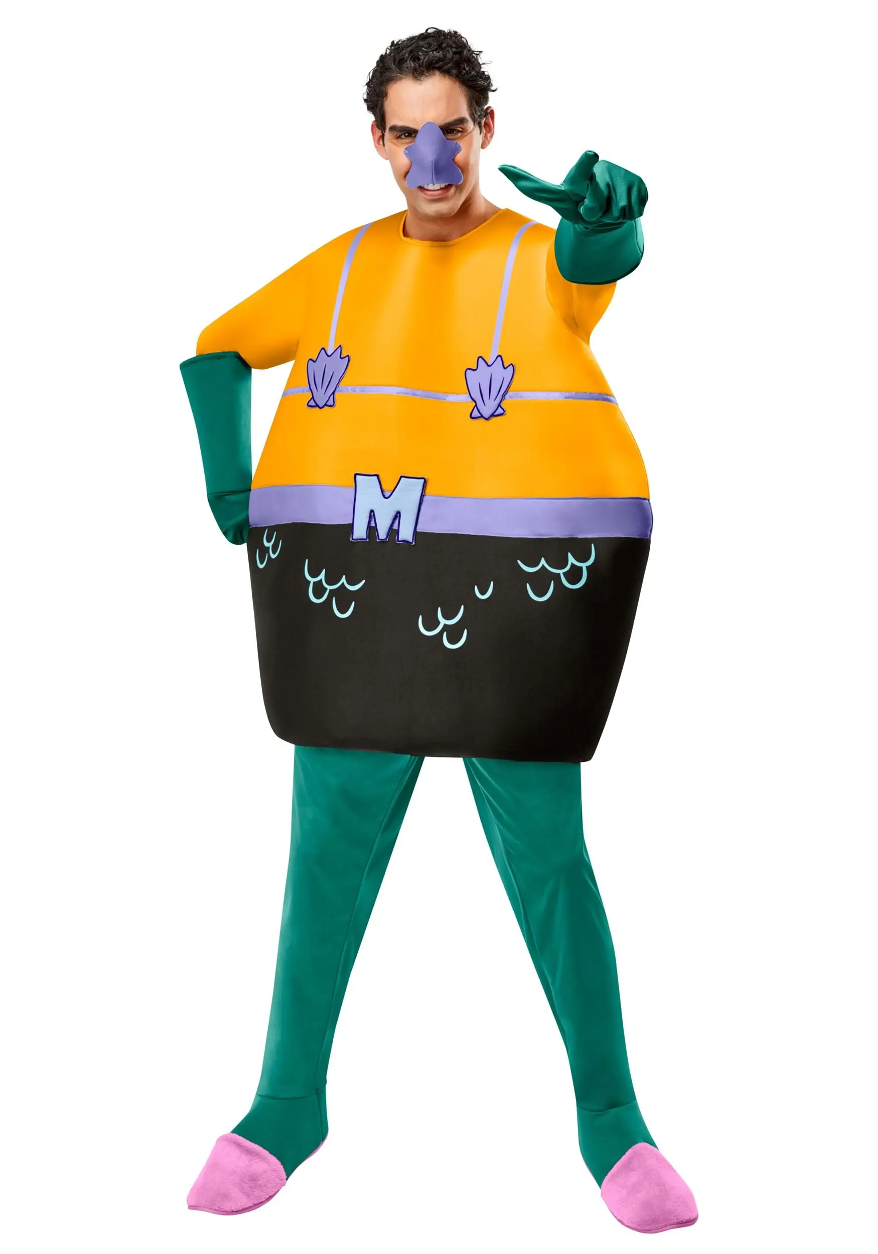 Suit up in super style when you wear this officially licensed Spongebob Squarepants Mermaid Man costume! This winning outfit has all you’ll need to bring the peculiar cartoon hero to life. The oversized tunic has a big-bellied construction and is printed to look just like Ernie’s iconic outfit. Matching green on the gloves and bottoms have you ready for anything under the sea while the starfish nose-mask will have every Spongebob fan recognizing you in an instant!
