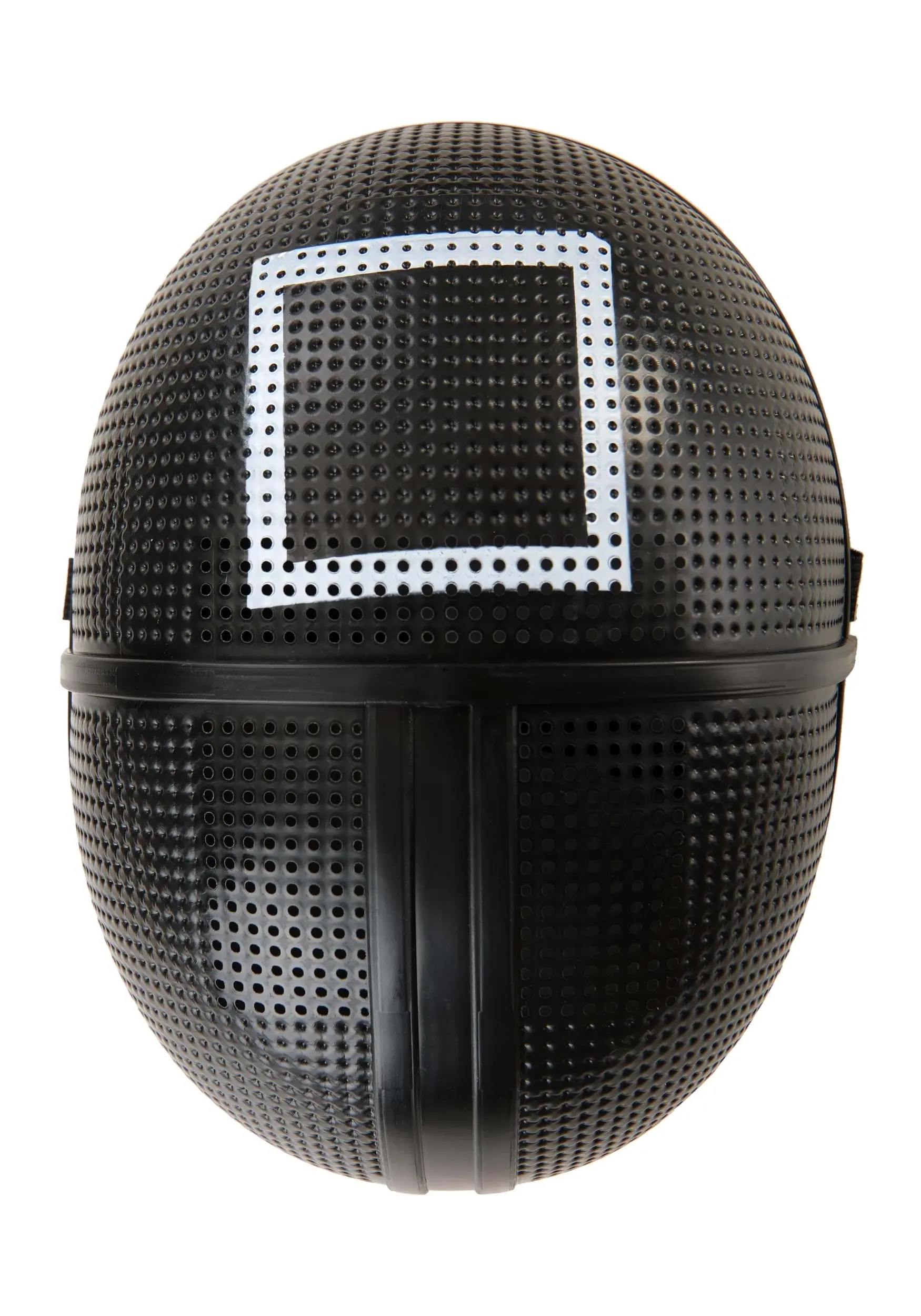 This Squid Game Square Mask is a black plastic mask that recreates the look of a simple fencing mask. It has a perforated front for vision, along with a white square on the top. The mask fits with an elastic band around the back. You can pair it up with a pink hoodie or jumpsuit to become a deadly gaming guard or pair it up with our circle and triangle version for a great group costume.